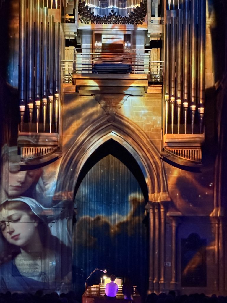 Pensée comme un dialogue entre patrimoine, musique et technologies lumineuses contemporaines, cette création accompagne les performances de l’orgue monumental interprété par Jean-Christophe Geiser. Lasers, projections architecturales et effets lumineux sculptent l’espace intérieur de l’édifice, révélant ses volumes, ses textures et sa verticalité, tout en respectant l’âme et la solennité du lieu.
